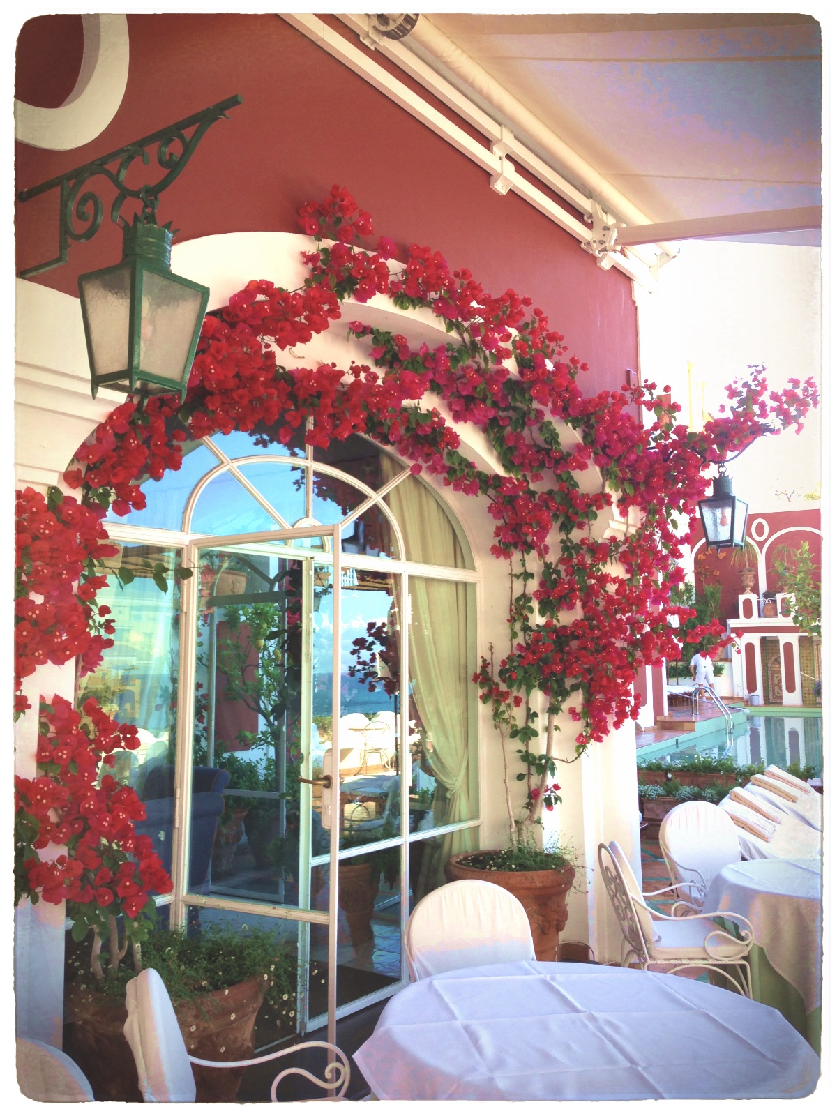 The hotel includes a terrace bar, and for pre-dinner cocktail hours, a champagne and oyster bar. There is a small, yet luxurious spa on the premises, that is if you can pull yourself away to use it. Across the street from the hotel are two hotel boutiques selling luxury Italian housewears like Carlo Moretti glass, and embroidered pillowcases, along with many fashion pieces, in case you forgot your swimsuit. The pool is small and the seating near it is limited, but it is very pretty being located on the flower covered terrace. And of course everything has astonishing views of the azure sea below.