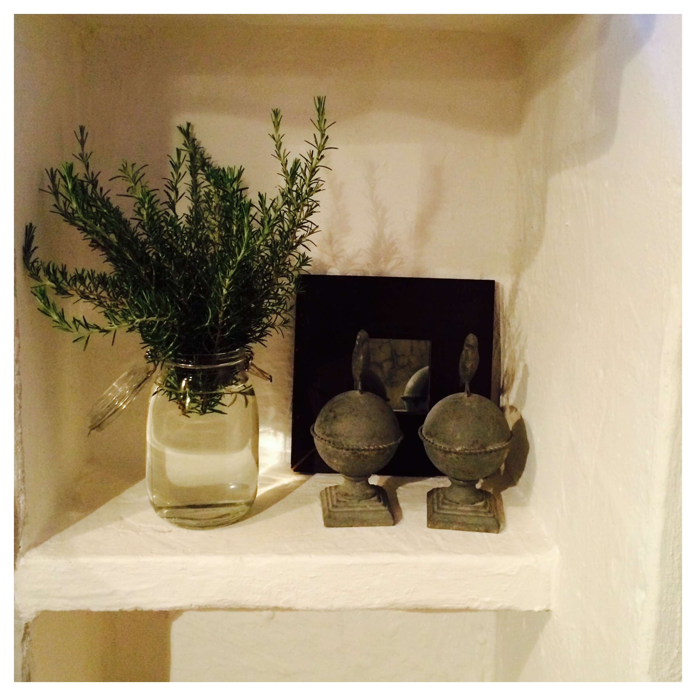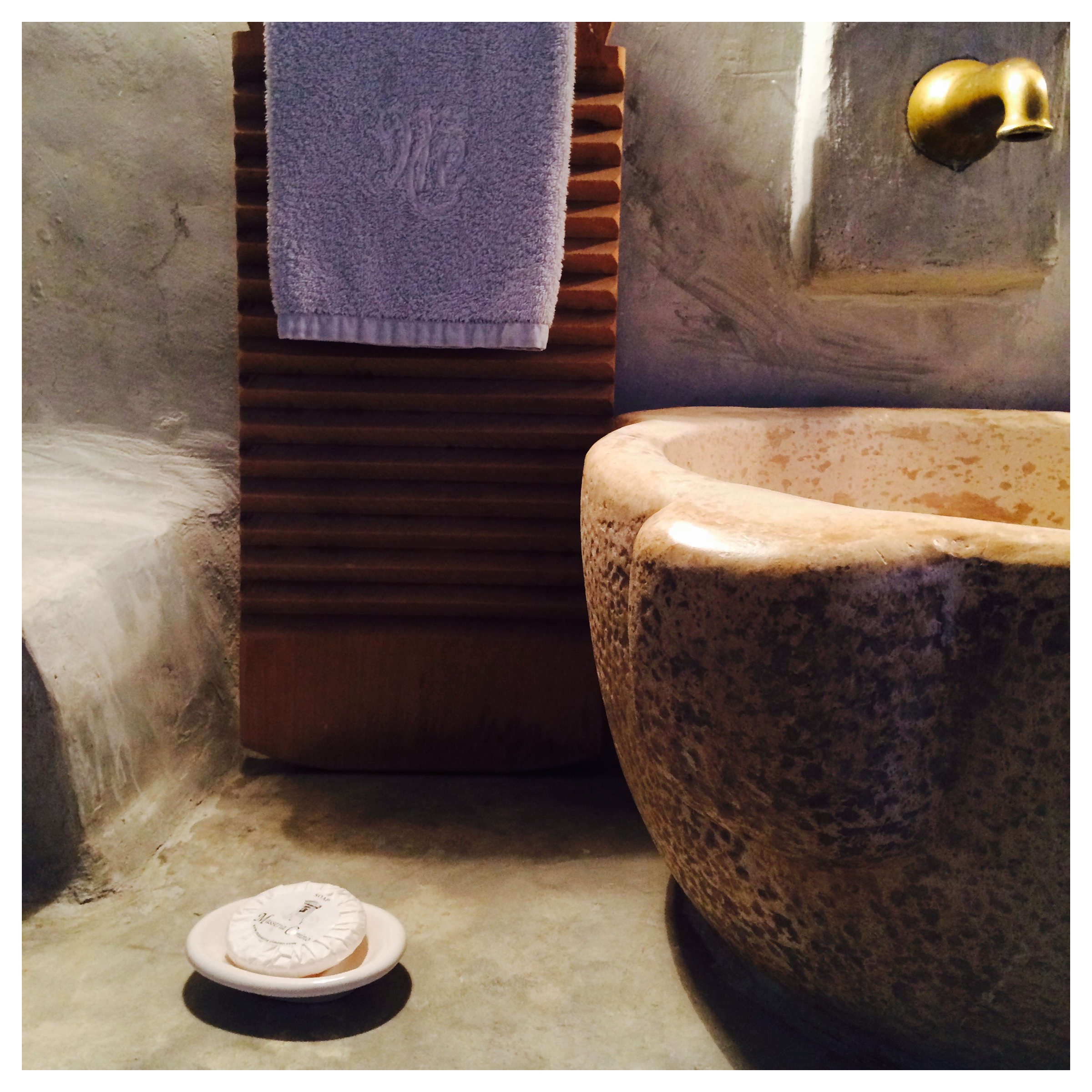 Rooms are harmonious with the setting yet design forward to the point of being worthy of a glossy magazine. White with pale blue-grey colour scheme complete with flowing white gauze drapery around a stone four poster bed and mood lighting. It is modern country chic. Large stone wash basins in the bathroom were gorgeous, all highlighted by the blue painted wooden shutters and accents throughout. Fresh greenery, some inside large glass vases, and the whimsical decorative touches added elegance to the cozy setting. Everything was there to convey tranquility while the design concept was exhilarating it was so pretty.