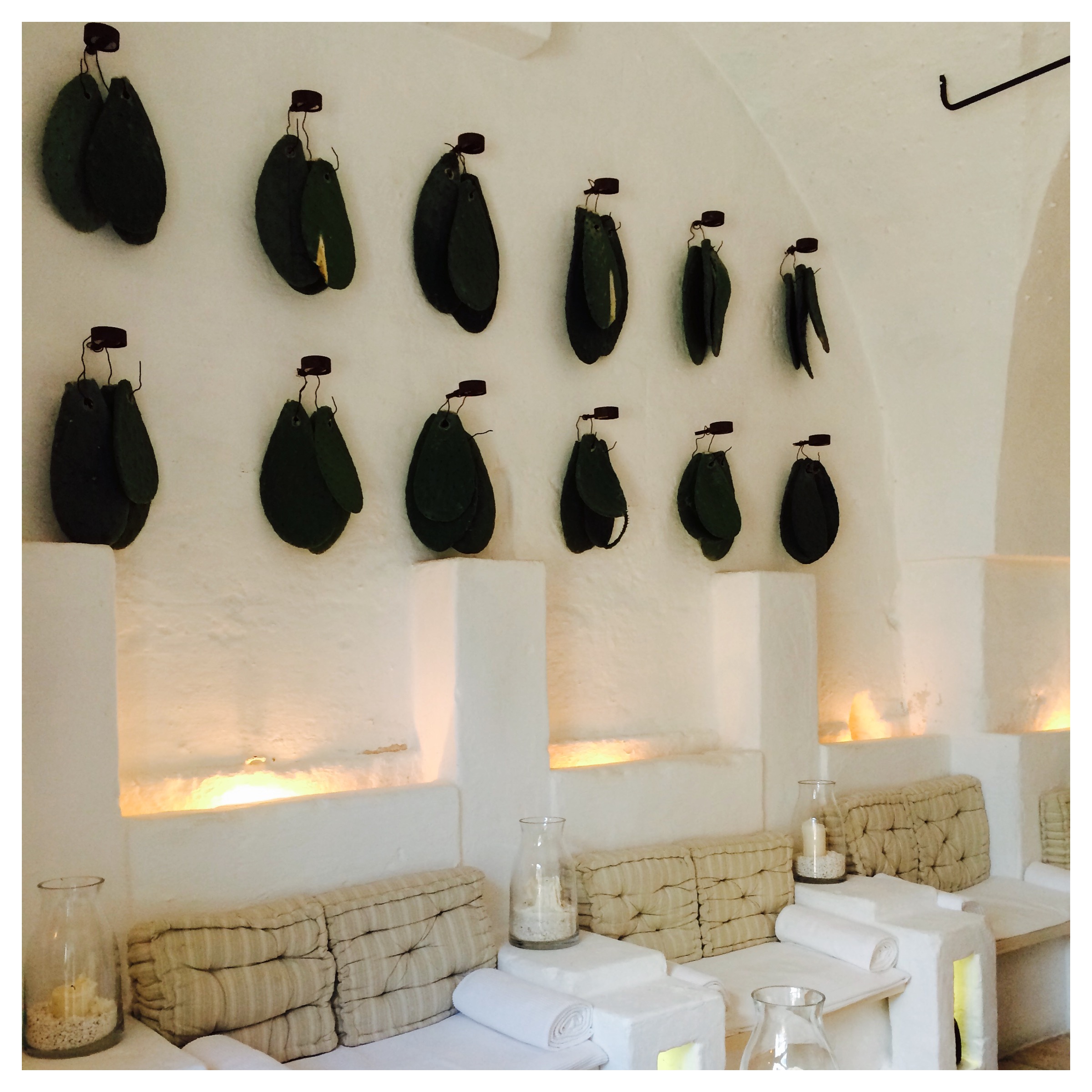 The central house has a small reception desk and sitting area, shared with a small white lounge bar all decorated with Pugliese details of delightful worn cowbells and bunches of cacti palms on the walls. The dining room was distinctly farmhouse fashionable with wooden chairs and tables painted blue and garnished by the dramatic flash of red colour from the groups of drying small tomatoes hanging from the ceiling. There was informal outdoor seating to enjoy the grounds and ancient olive tress, plus a short five minute walk to the beach and bright blue waters. The natural element is very much part of the design theme throughout the property and it is used in a playful contemporary way to create a tranquil oasis.