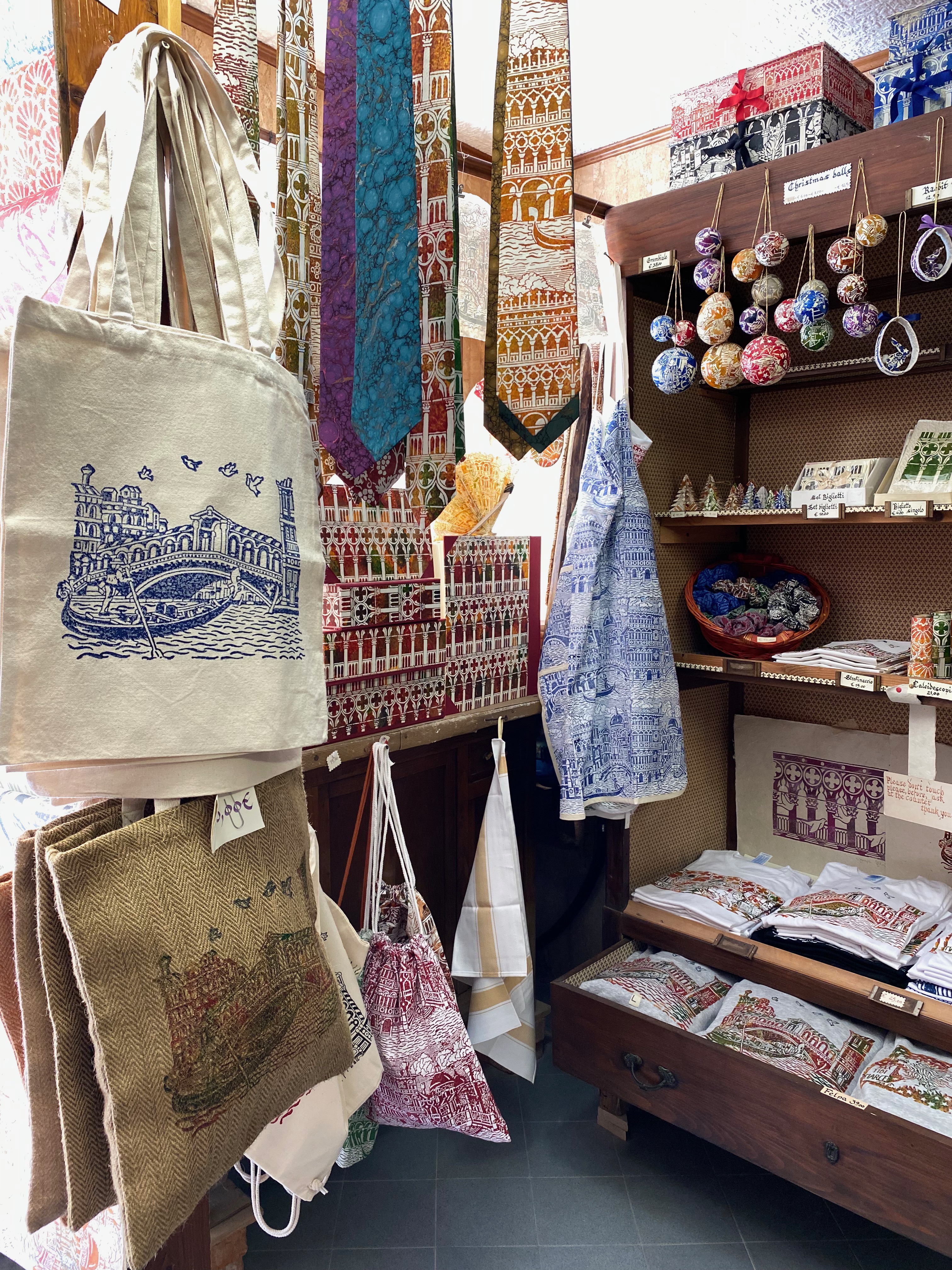 Il Pavone: This tiny shop and work studio next to the Guggenheim Shop is an old style printing shop making prints from wood blocks with bold designs. What makes this place a bit different is they don’t only print paper products, they print on fabric as well so I always swing by to pick a few of their t-shirts, tote bags and small fabric bags to use for travel or at home. And they don’t take up too much room in the suitcase! Sotoportego e Corte Venier dei Leoni, 721, 30123 Venezia VE, Italy