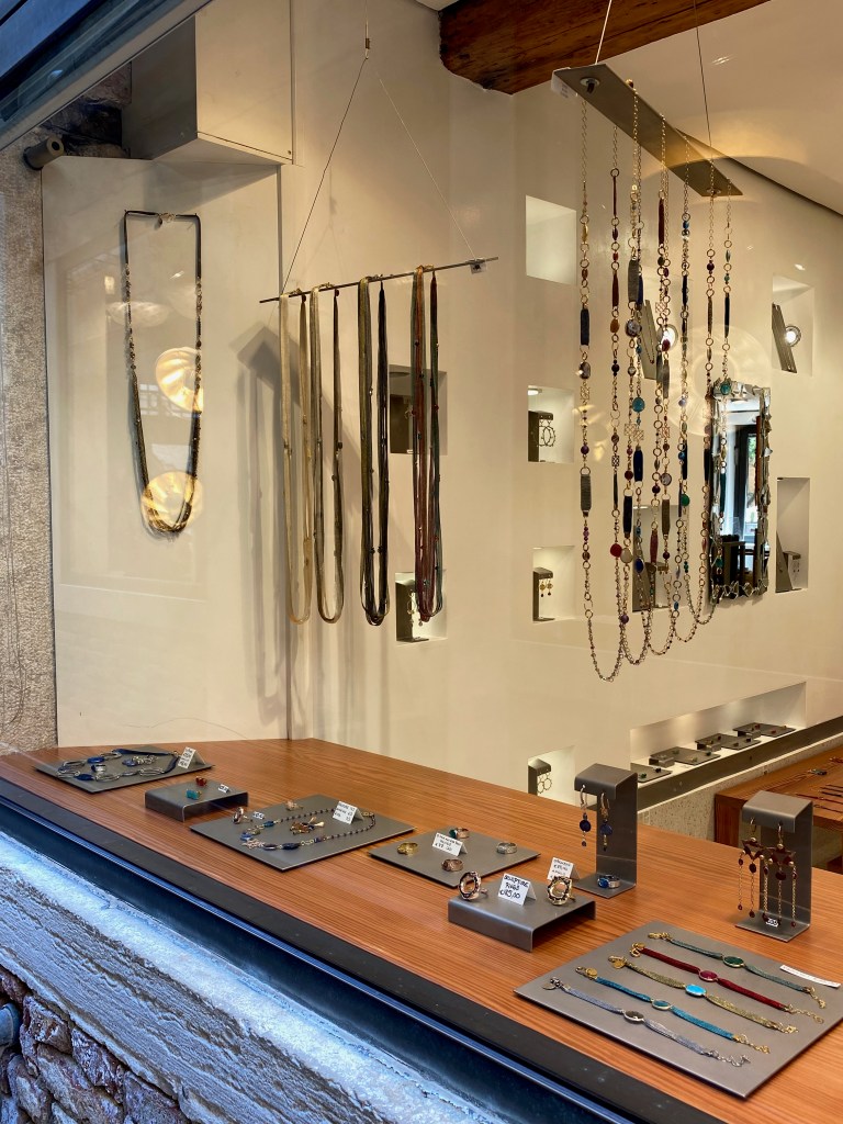 Designs 188: Part of an Italian woman’s wardrobe are unique jewelry pieces. Bold, or arty, but always chic and individual. The items in Designs 188 are a mix of contemporary design jewelry mixed with local Murano glass for elegant statement pieces. I love the thick glass rings and the mesh necklaces. Calle del Bastion 188, Dorsoduro