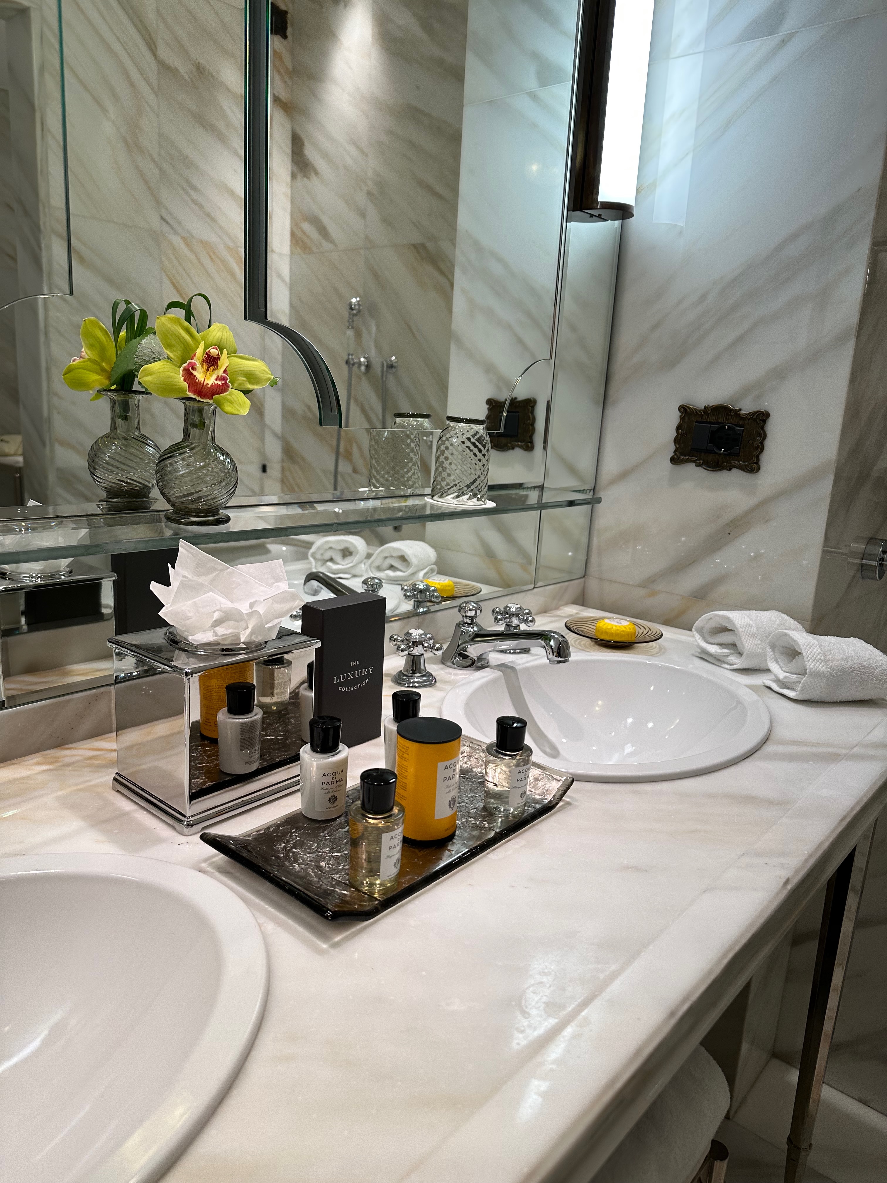 The bathroom was equally grand and spacious. White marble, and a large bathtub which I love! and so rare these days. I enjoyed a decadent bubble bath (again, just like in the movies) with their deluxe Aqua di Parma bath products generously replenished throughout my stay,
