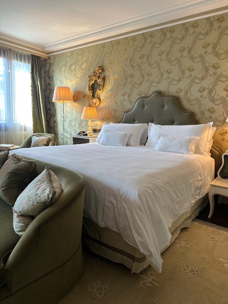 After a very relaxed check-in I was taken up to my very spacious room, a rarity in Venice especially in an old establishment. While I did not have a front Canal view, those are mainly for suite stays, my room did have a nice view of the Campo outside with lots of light coming through the windows. The room decor did continue the palazzo theme but in a more contemporary way so it felt elevated and not stuffy as many period hotels tend to be. Very comfortable, especially the bed which was luxurious on every level.